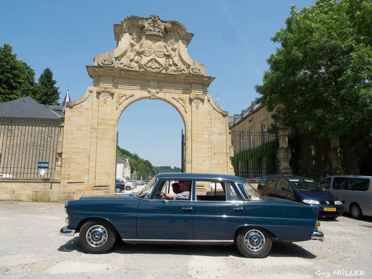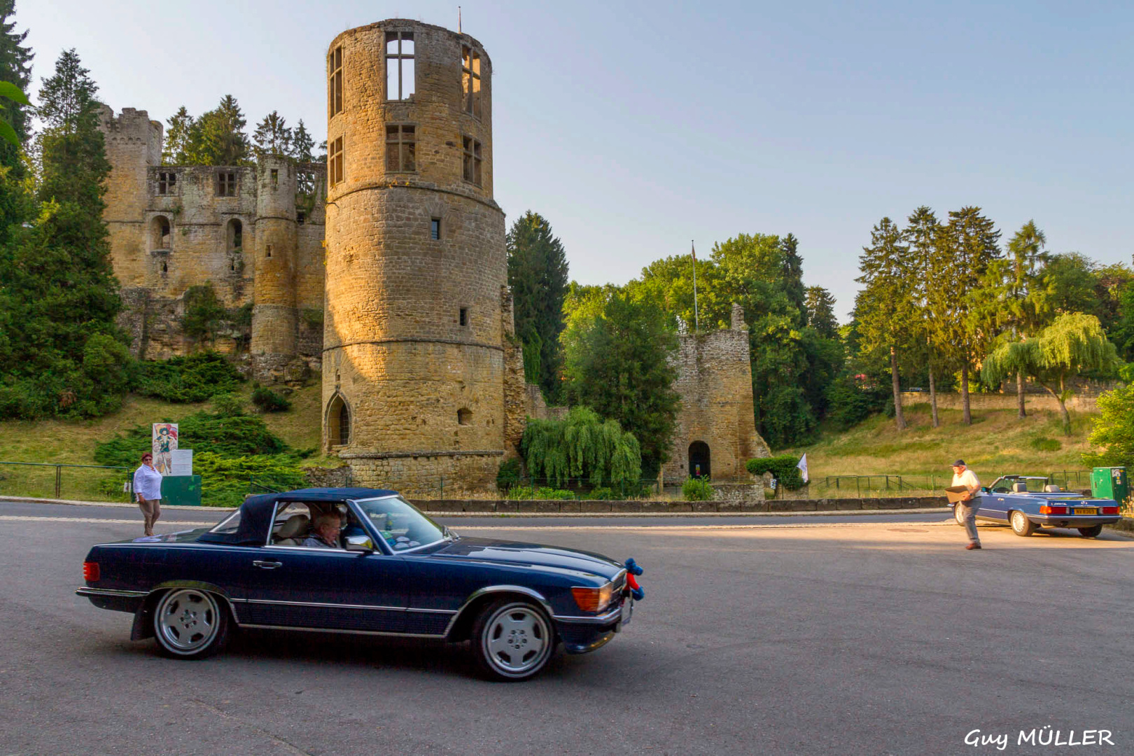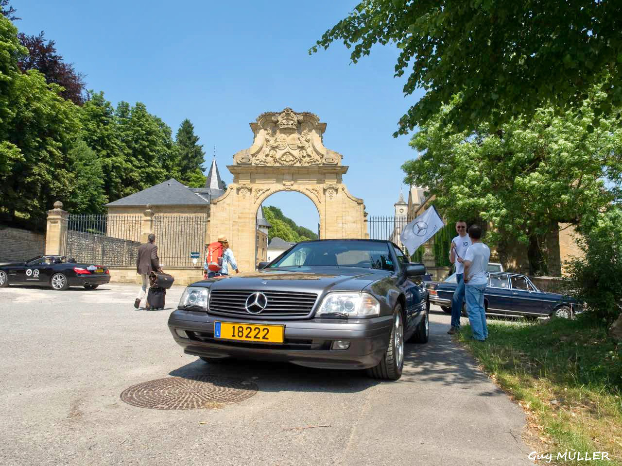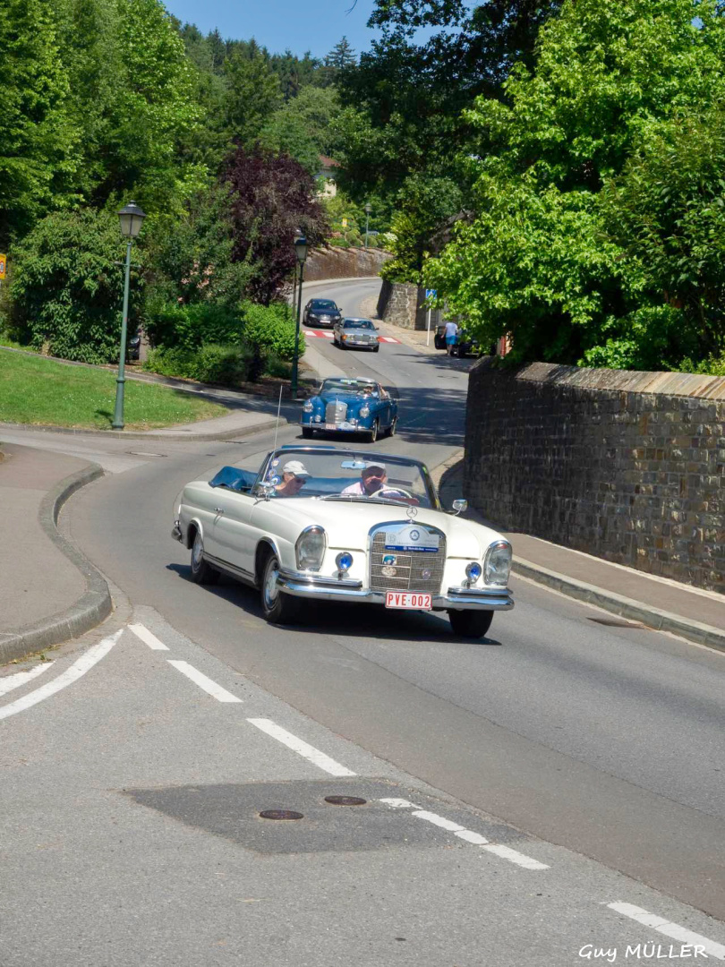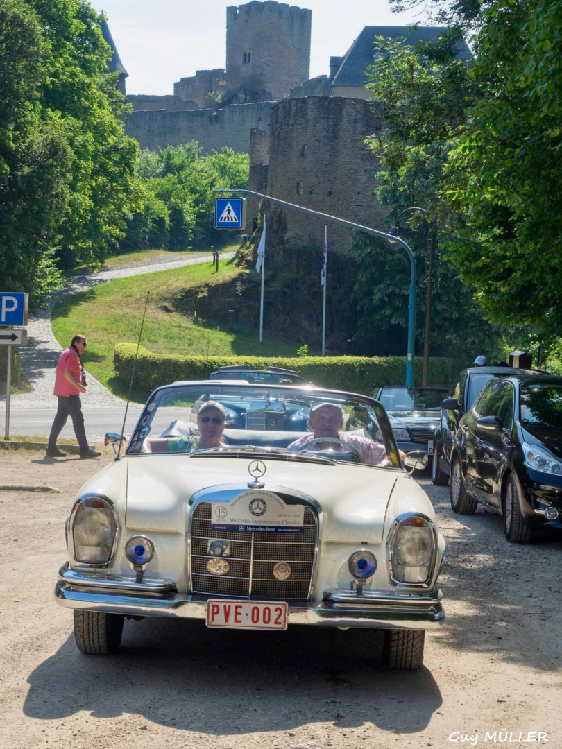 Das Roadbook führte über Bettendorf in Richtung Vianden, bevor wir nach Brandenbourg abbogen. Dort wurde vor der Schlosskulisse den Teilnehmern eine Schirmmütze mit Clublogo ausgehändigt, um vor dem Sonnenbrand zu schützen. Weiter ging die Fahrt nach Merscheid und zur Goebelsmühle, durch Lipperscheid nach Bourscheid. Beim Schloss war ein Zwischenstopp und es wurden frisches Wasser und hausgemachte Marmelade in die Autos verteilt. Kehmen, Welscheid, Nieder- und Oberfeulen sowie Colmar-Berg waren die folgenden Etappen. Beim großherzoglichen Schloss stand der Clubfotograf um passende Bilder zu schießen. Bei der Weiterfahrt kamen die Fahrzeuge noch an den Schlössern in Pettingen, Meysembourg und Fischbach vorbei, bevor sie nach und nach im Hof des „Blannenheem“ in Rollingen eintrafen. Im Festsaal des Heims waren bereits die Tische zum Mittagessen vorbereitet, und es tat gut, aus der Hitze in den gut belüfteten, kühlen Saal einzutreten.