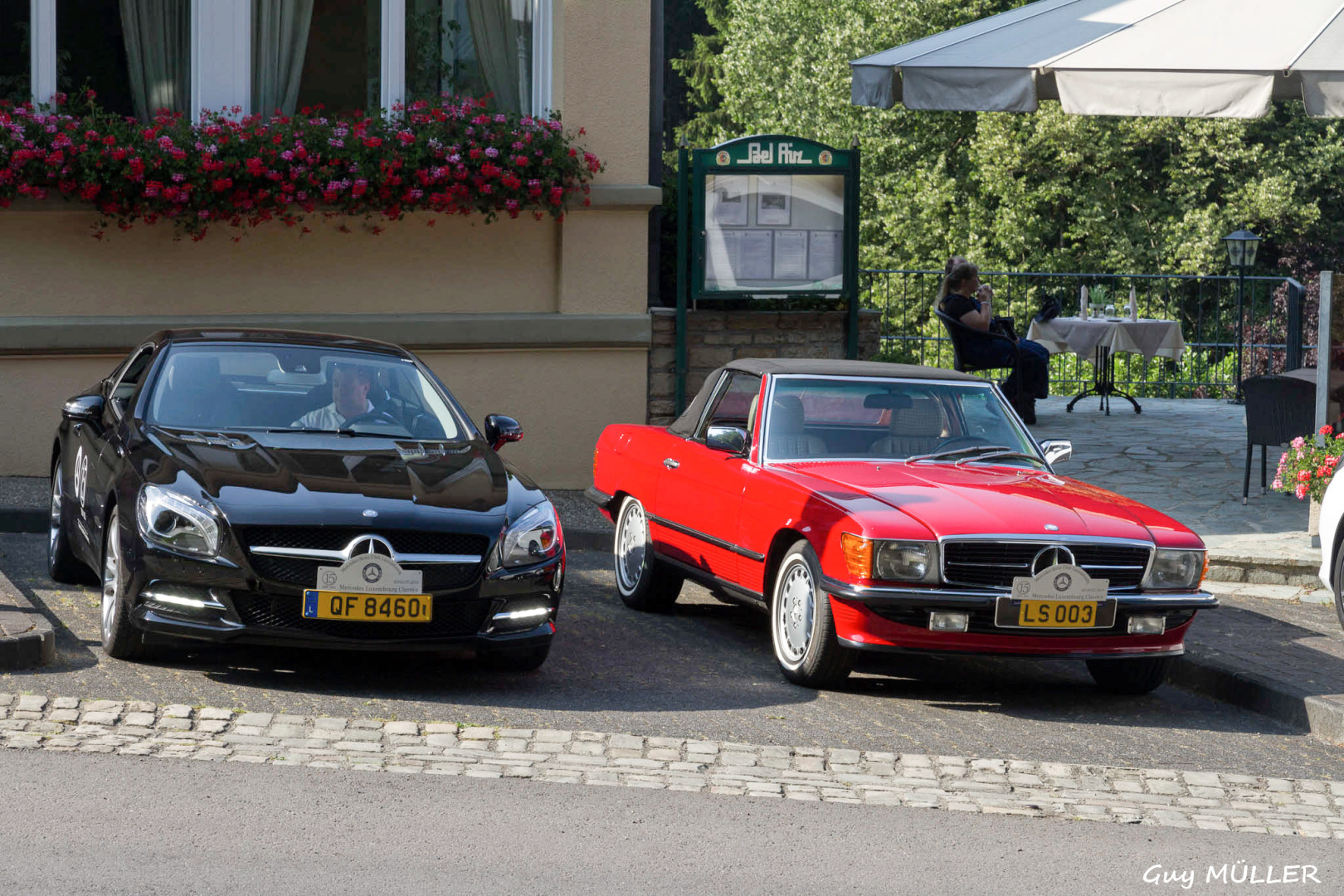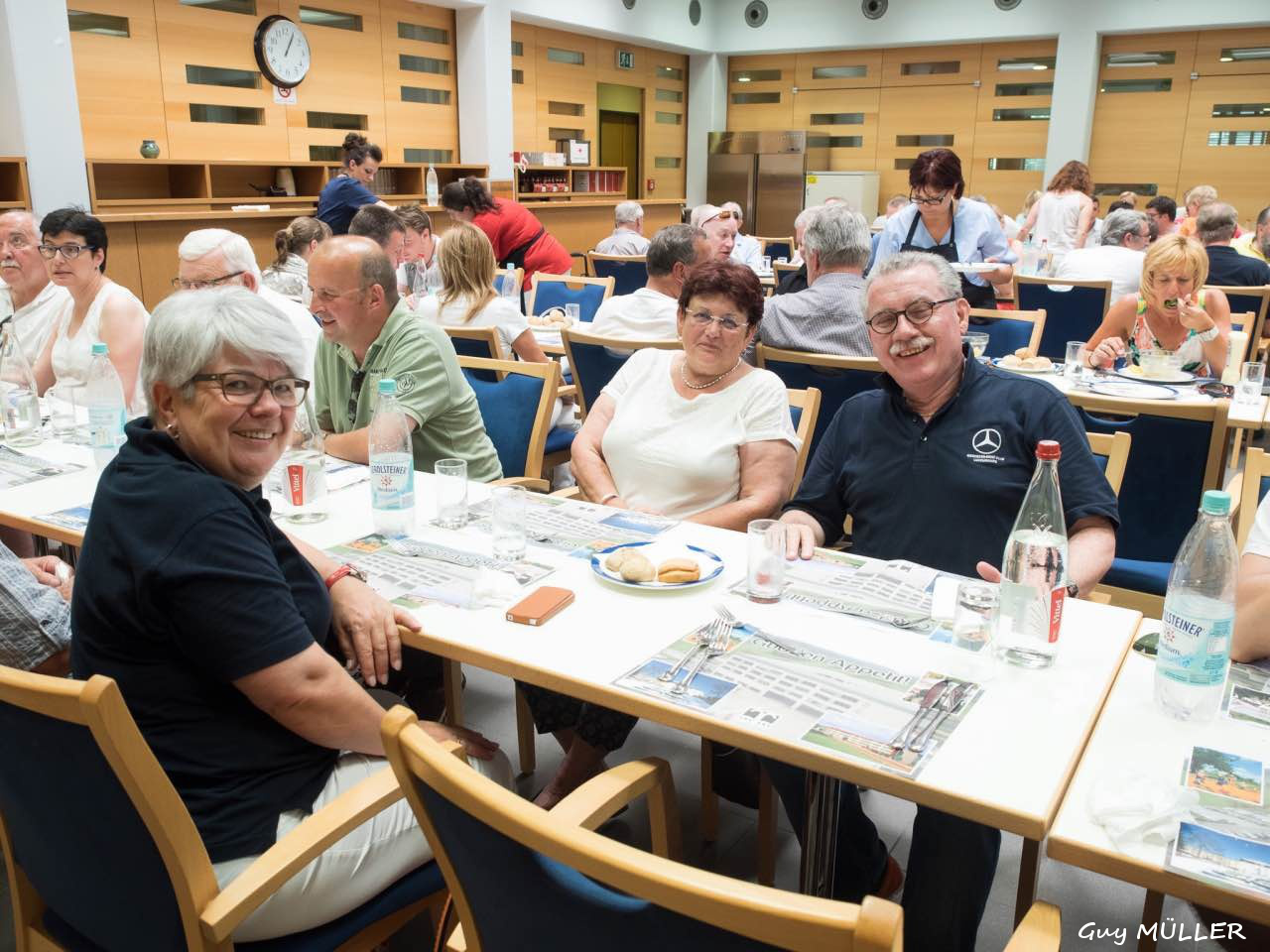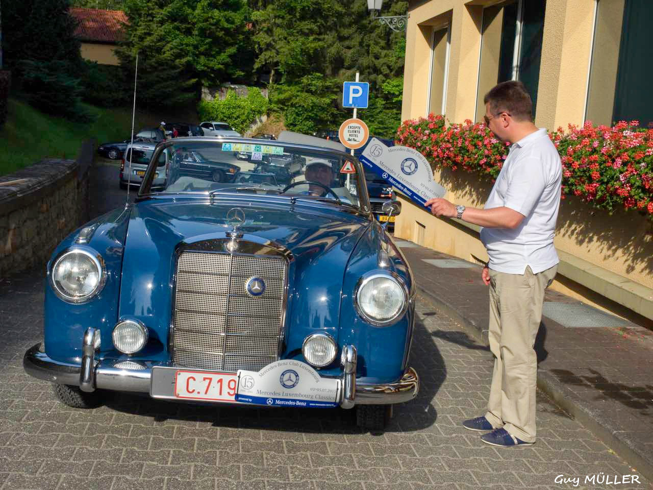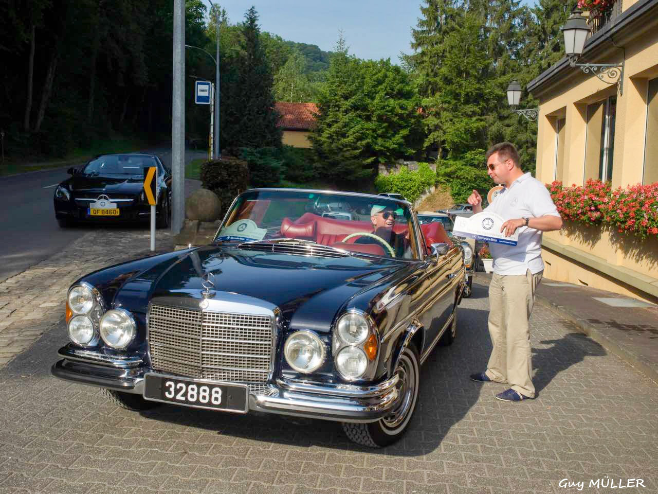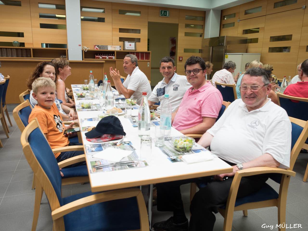 Das Roadbook führte über Bettendorf in Richtung Vianden, bevor wir nach Brandenbourg abbogen. Dort wurde vor der Schlosskulisse den Teilnehmern eine Schirmmütze mit Clublogo ausgehändigt, um vor dem Sonnenbrand zu schützen. Weiter ging die Fahrt nach Merscheid und zur Goebelsmühle, durch Lipperscheid nach Bourscheid. Beim Schloss war ein Zwischenstopp und es wurden frisches Wasser und hausgemachte Marmelade in die Autos verteilt. Kehmen, Welscheid, Nieder- und Oberfeulen sowie Colmar-Berg waren die folgenden Etappen. Beim großherzoglichen Schloss stand der Clubfotograf um passende Bilder zu schießen. Bei der Weiterfahrt kamen die Fahrzeuge noch an den Schlössern in Pettingen, Meysembourg und Fischbach vorbei, bevor sie nach und nach im Hof des „Blannenheem“ in Rollingen eintrafen. Im Festsaal des Heims waren bereits die Tische zum Mittagessen vorbereitet, und es tat gut, aus der Hitze in den gut belüfteten, kühlen Saal einzutreten.