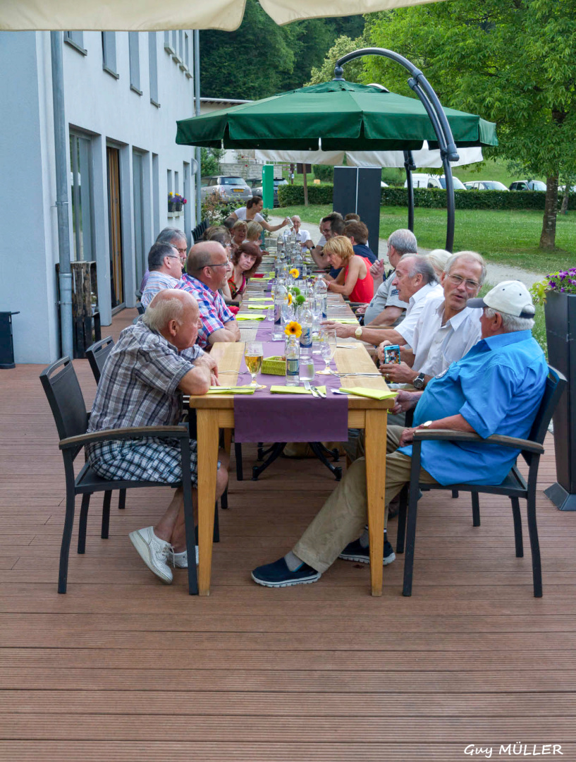 Anschließend ging es gleich wieder in die Fahrzeuge, um den ersten Teil des Roadbooks abzufahren. Mit einer kurzen Zwischenetappe vor dem Schloss in Befort, wo den Teilnehmern ein erstes Geschenk in Form einer Flasche Cassis aus der Schlossproduktion überreicht wurde, ging die Fahrt zur „Heringer Millen“ in der sogenannten „Luxemburger Schweiz“. Beim Aperitif begrüßte Clubpräsident Jean-François Zimmer die Clubmitglieder und ausländischen Gäste, bedankte sich für ihre Teilnahme und gab einen Ausblick auf das Programm der kommenden Tage. Bei herrlichem Wetter genossen wir das Abendessen auf der Terrasse und im angrenzenden Speisesaal im gemütlichen Freundeskreis. Gegen 23 Uhr begab sich die Fahrzeugkolonne dann auf einem kürzeren Weg zurück ins Hotel. Da die meisten Teilnehmer entweder eine lange Anfahrt oder anstrengende Vorbereitungstage hinter sich hatten, fiel der Aufenthalt in der Hotelbar relativ kurz aus.