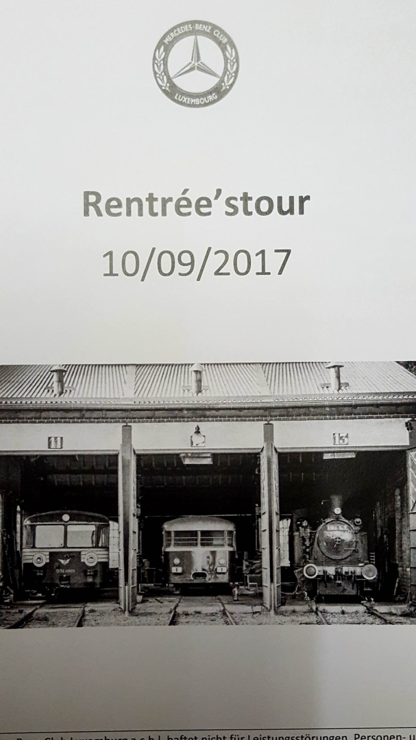 Am Sonntag, dem 10. September 2017, trafen sich die Mitglieder des Mercedes-Benz Club Luxembourg in der Industriezone „Klengbousbierg“ in Bissen. Als Auftakt zur diesjährigen „Rentrées’tour“ nach den Sommerferien stand eine Besichtigung der Produktionsanlagen der Firma Flowey auf dem Programm. Flowey ist international bekannt durch die Herstellung der zur Reinigung und Pflege von Fahrzeugen dienenden Produkte, die man als Einzelkunde in vielen Fachgeschäften kaufen kann. Daneben stellt die Firma ebenfalls Produkte für Autowaschanlagen her. Unter der fachkundigen Führung der Besitzer wurden wir in die Herstellung eingeweiht und konnten die Anlagen sowie das Lager besichtigen. Das von Paul Origer vorbereitete Roadbook führte anschließend durch Öslinger Landschaften und gegen Mittag erreichten wir Pommerloch, wo das Mittagessen aufgetischt wurde. Am Nachmittag fuhren wir in Richtung Süden des Landes. Angekommen im Fond-de-Gras besichtigten wir dort die Eisenbahnhallen des „Train 1900“ und wurden über die Geschichte und die Aktivitäten der Organisation unterrichtet, die sich um den Erhalt der Anlagen und Maschinen kümmert.
