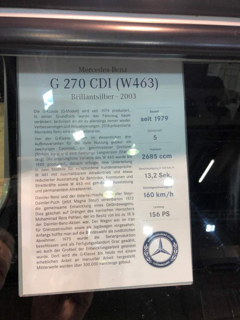 Ausgestellt waren ein 280 SL der Baureihe 113 aus 1970, ein 450 SLC 5.0 der Baureihe C107 aus 1980, ein 230 E der Baureihe 123 aus 1982, ein 300 SE der Baureihe 126 aus 1986, ein 300 TE der Baureihe S124 aus 1991, ein 300 SL-24 der Baureihe 129 aus 1992, sowie ein G 270 CDI der Baureihe 463 aus 2003. Als Neufahrzeug stand eine S-Klasse, die von Merbag Luxembourg zur Verfügung gestellt wurde, in der Standmitte.