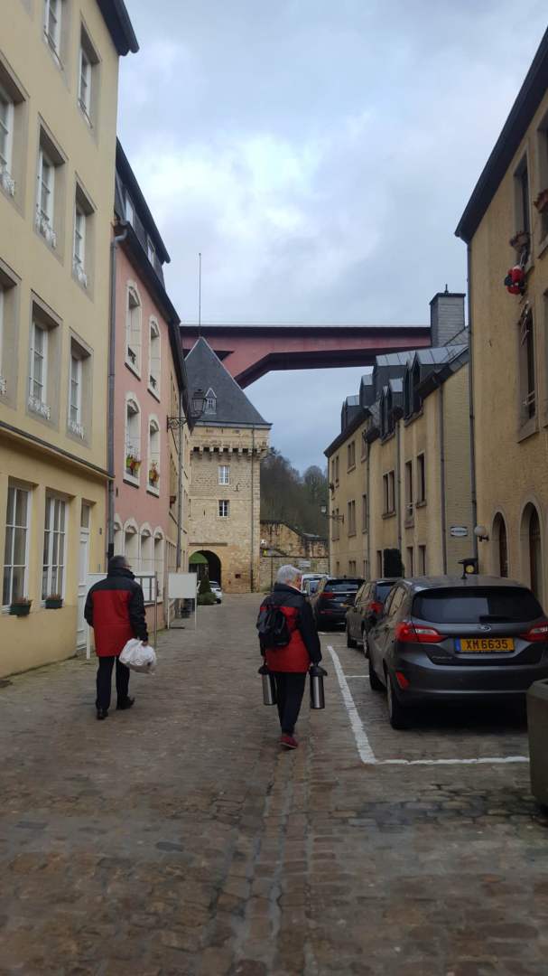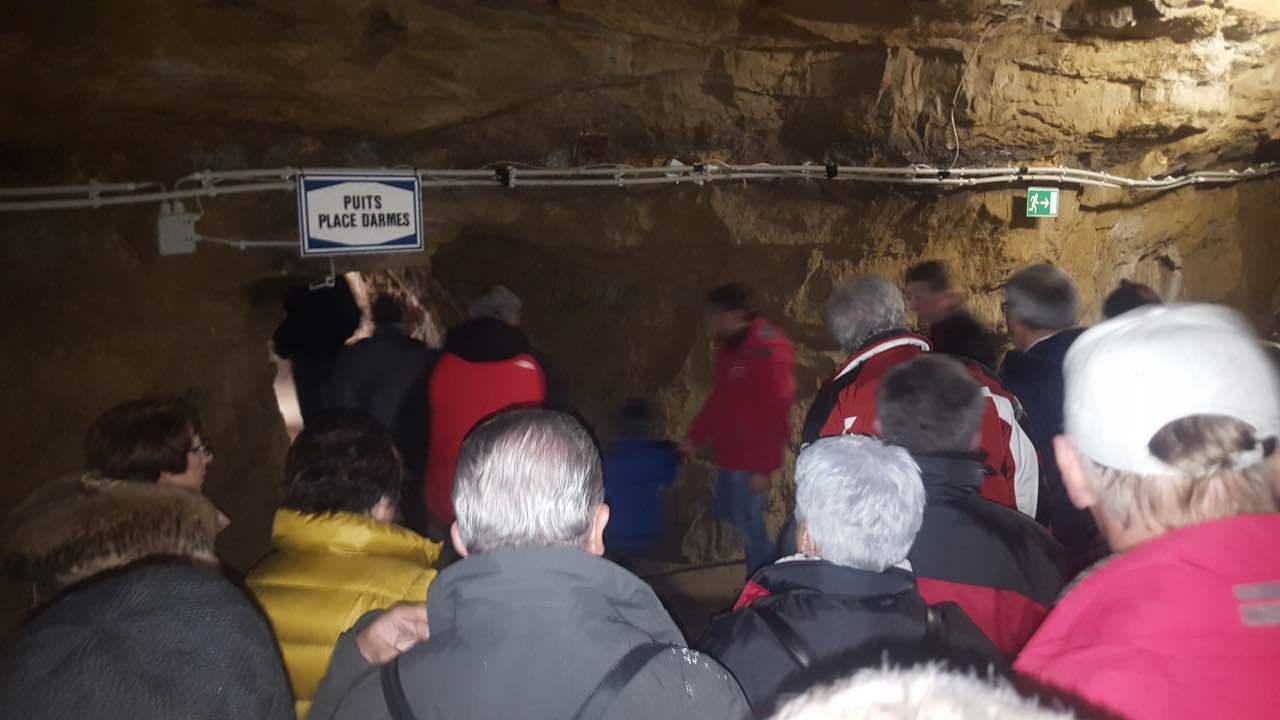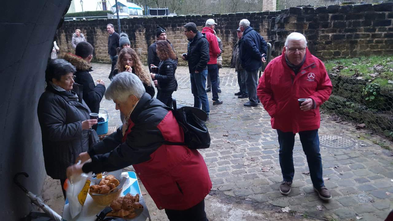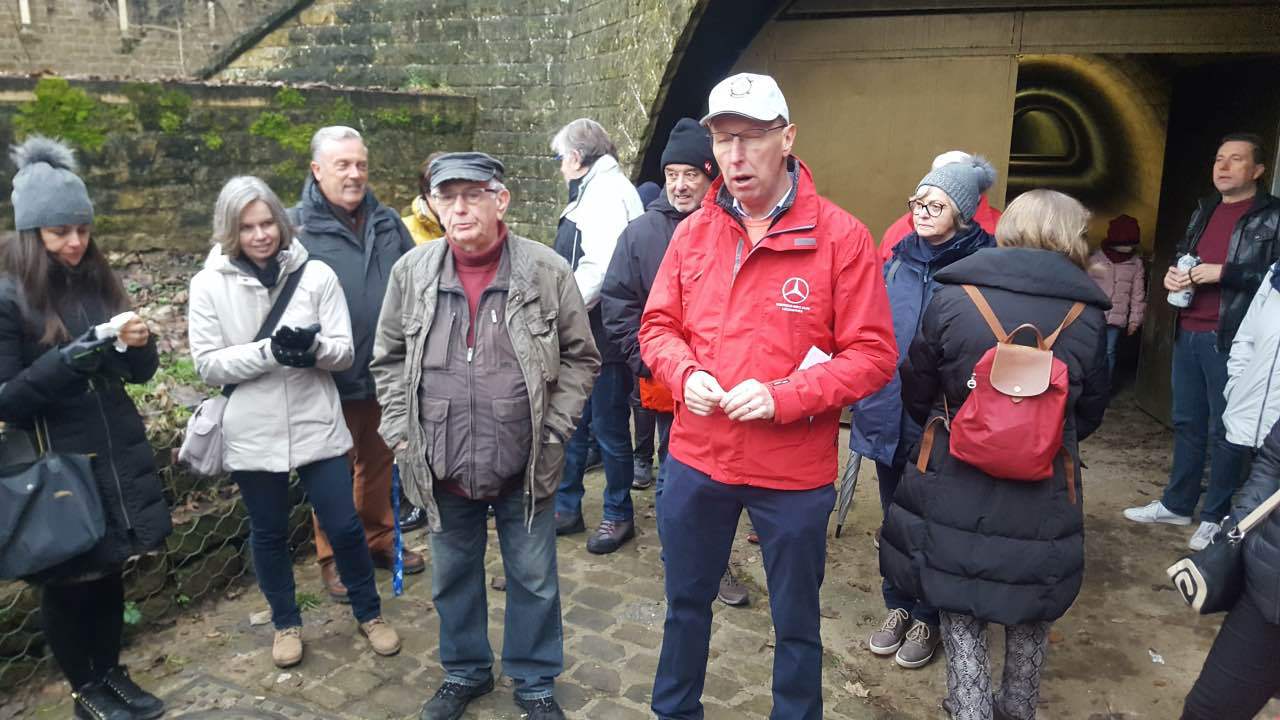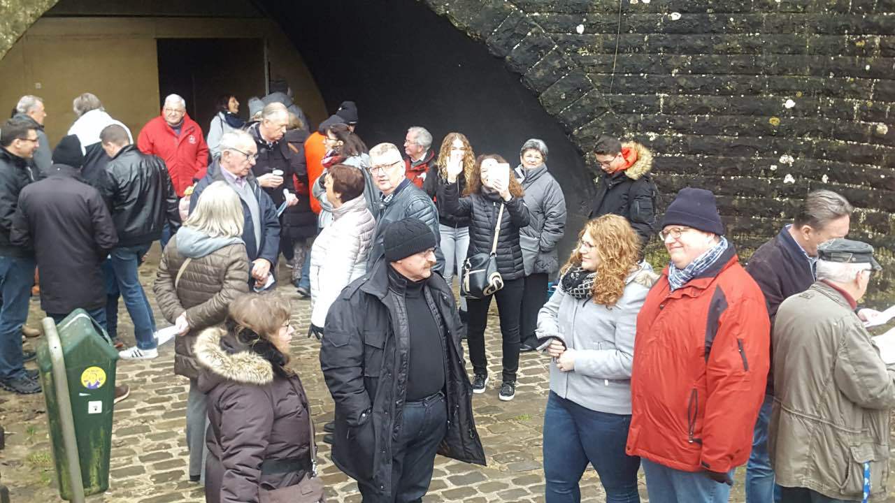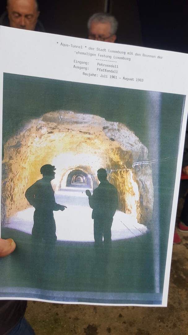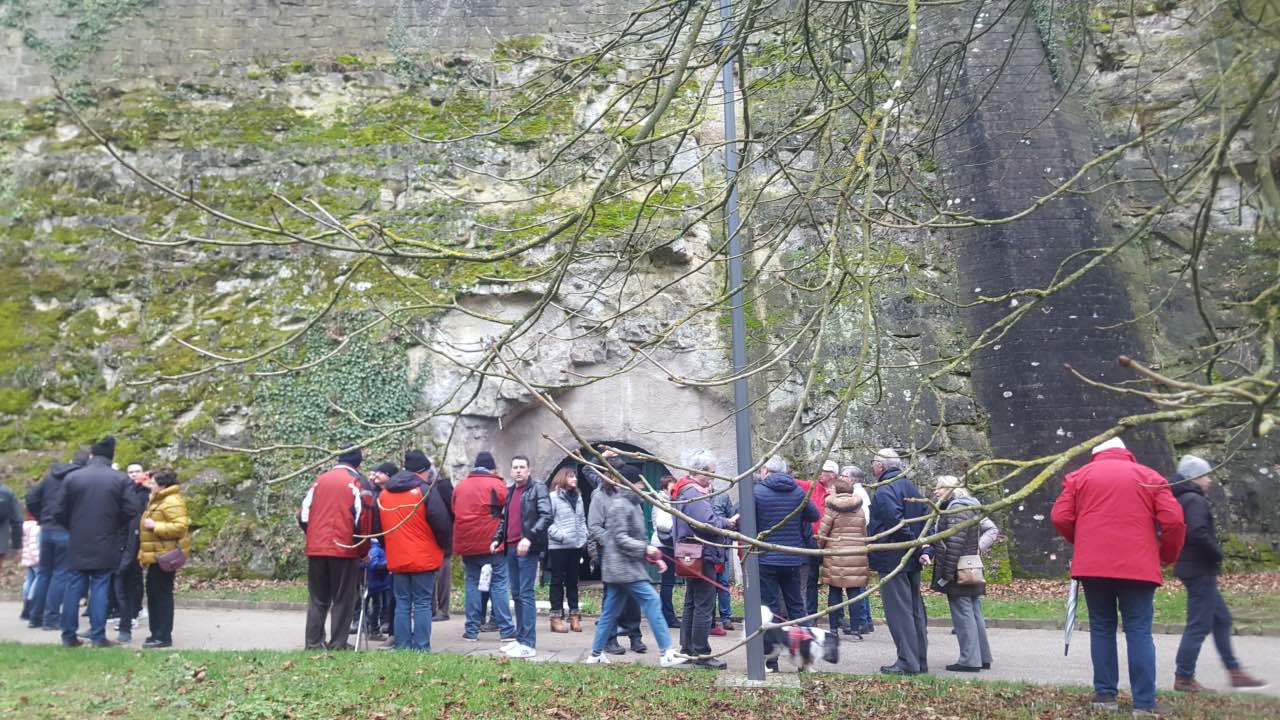 Als Auftakt der Clubaktivitäten war dieses Jahr unsere „Trëppeltour“ wieder die erste Gelegenheit, um uns unter Freunden wie- derzusehen. Am Sonntag, dem 9. Februar 2020 hatten sich 49 Neugierige und Bewe- gungshungrige in Pfaffenthal getroffen, um an der von Vorstandsmitglied Guy Rolling organisierten Tour teilzunehmen, bei der wir die Stadt Luxemburg auf eine ungewohnte Weise erkunden sollten. Nach dem obliga- ten Café-Croissant öffneten sich die Tore zur Unterwelt und wir tauchten ein in den Bauch der Stadt. Vor uns tat sich der 900 m lange Aquatunnel auf, der die Unterstadt Pfaffent- hal mit dem Petrusstal verbindet. Entgegen der Erwartungen handelt es sich hier nicht um eine Kasematte der Festungsanlage, son- dern um eine Konstruktion neueren Datums die friedlichen Zwecken dient, und zwar als Kanal, der das Abwasser der Stadtteile Merl, Belair und Cessingen zur Kläranlage in Beg- gen leitet. Der alte Kanal konnte nicht er- neuert werden, und so war dieser Tunnel, der in den Jahren 1961 bis 1963 in den Fels gesprengt wurde, der kürzeste Weg für eine neue Ableitung. Diese Verbindung liegt rund 50 m unter der Stadt und zeigt auf Straßen- schildern an, unter welcher Straße man sich gerade befindet. Besonders beeindruckend ist der Festungsbrunnen der Place d’Armes, durch den man vom Tunnel aus den Blick nach oben richten und das Tageslicht erbli- cken kann.