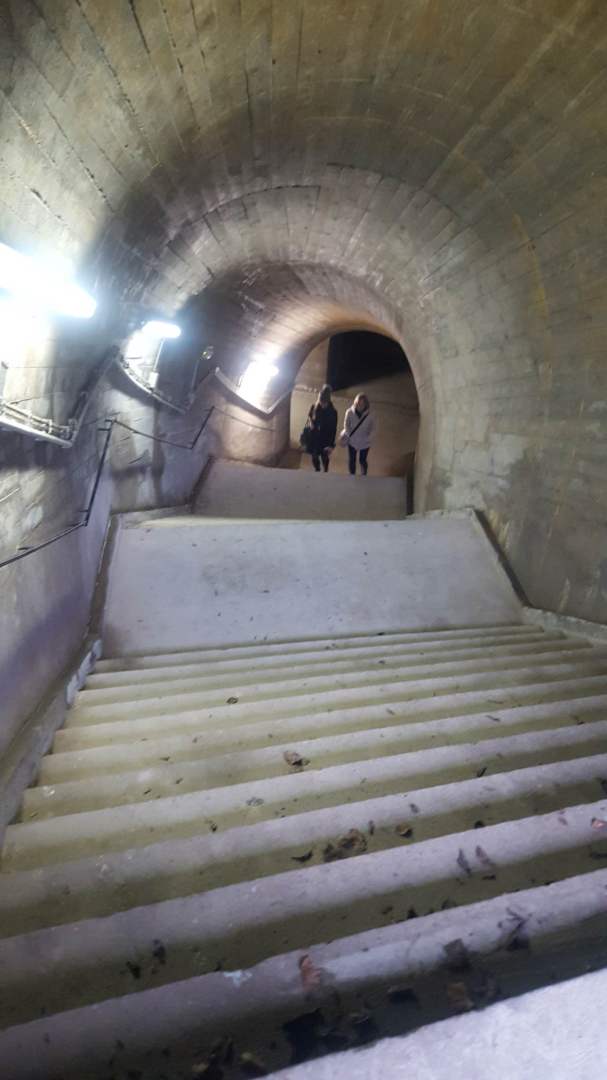 Die zweite Etappe der Tour galt dann aber den „richtigen“ Gängen unter den Festungs- anlagen. Nach einem kurzen Fußmarsch gelangten wir zur Standseilbahn, mit der wir vom neu geschaffenen Bahnhof Pfaffenthal/ Kirchberg zur Tramhaltestelle am Plateau Kirchberg hochfuhren. Unser Stadtführer hatte auch hier den Schlüssel zur Unterwelt, die sich hinter einer mit einem Gitter abgesi- cherten Treppe auftut. Die allerwenigsten der rund 1.000.000 (!) jährlichen Benutzer der Standseilbahn wissen wohl kaum, dass sich hier der Eingang einer Kasematte befindet, die das frühere Fort Olizy mit dem Fort Nie- der-Grünewald verbindet.