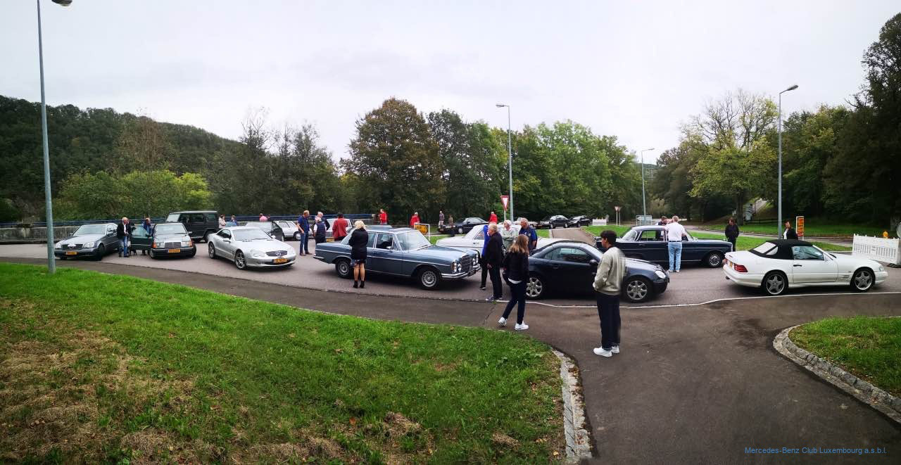 Vorstandsmitglied Patrick Wehr hatte mit genügend zeitlichem Abstand die Route ausgewählt und das Roadbook erstellt. Das war gegen Ende des Kollektivurlaubs im Bauwesen – da war die Welt der Straßen noch in Ordnung. Als wir einige Tage vor der Aus- fahrt die Strecke zur Kontrolle noch einmal abfuhren, waren die fleißigen Arbeiter des Straßenbaus aus der Urlaubsstarre erwacht, und die erste Hälfte der Strecke war mit Ab- sperrungen und Umleitungen gespickt. Da blieb nur noch eins: Wieder von vorne anfangen und eine neue Route suchen, was nach ei- nigem Hin und Her dann schließlich gelang. Der gewählte Tag war im wahrsten Sinne des Wortes getrübt, denn das Wetter bescher- te uns Nebel und Regen. Die 52 Teilnehmer wurden bei einsetzender Herbstwitterung am Park & Ride Junglinster, wo der Start erfolgte, ordentlich abgekühlt und angefeuchtet. Zu- sätzlich musste sich unser Clubvorsitzender Jean-François Zimmer mit einer Hiobsbotschaft an uns wenden. Unser langjähriges Mitglied und regelmäßiger Teilnehmer an unseren Ausfahrten, Raoul Roos, der auch zu dieser Tour angemeldet war, war nur wenige Tage vorher völlig unerwartet gestorben.