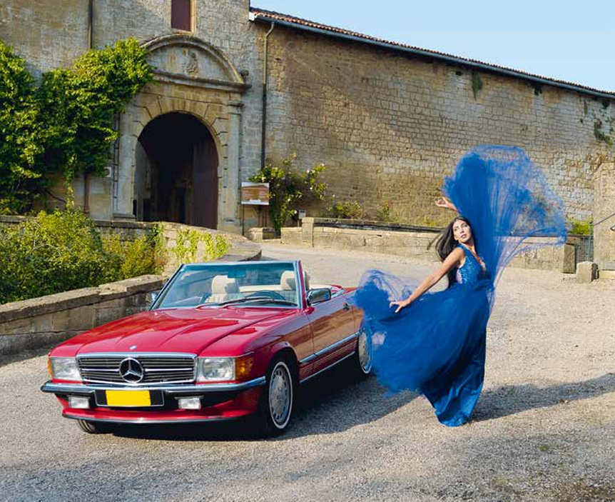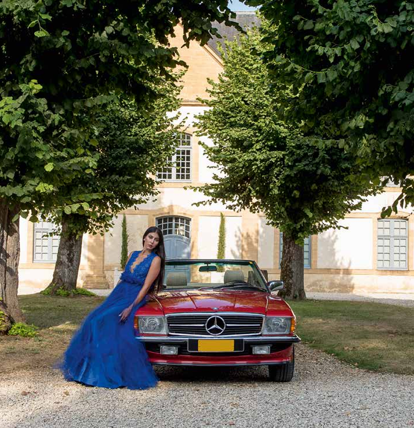 Habillée telle une princesse d’une féerique robe bleue, Katia découvre le domaine majestueux du Clos de Lorraine, qui semble sorti tout droit d’un conte de fées. Pour parfaire le tableau, elle pose à côté d’une légendaire Mercedes-Benz 300 SL de 1986, dont le rouge vif fait vibrer les pierres ancestrales du château.