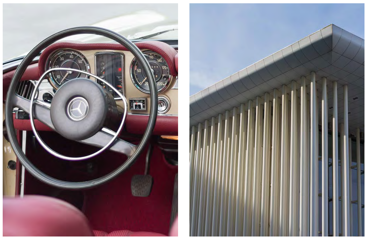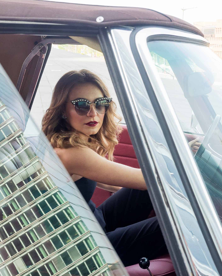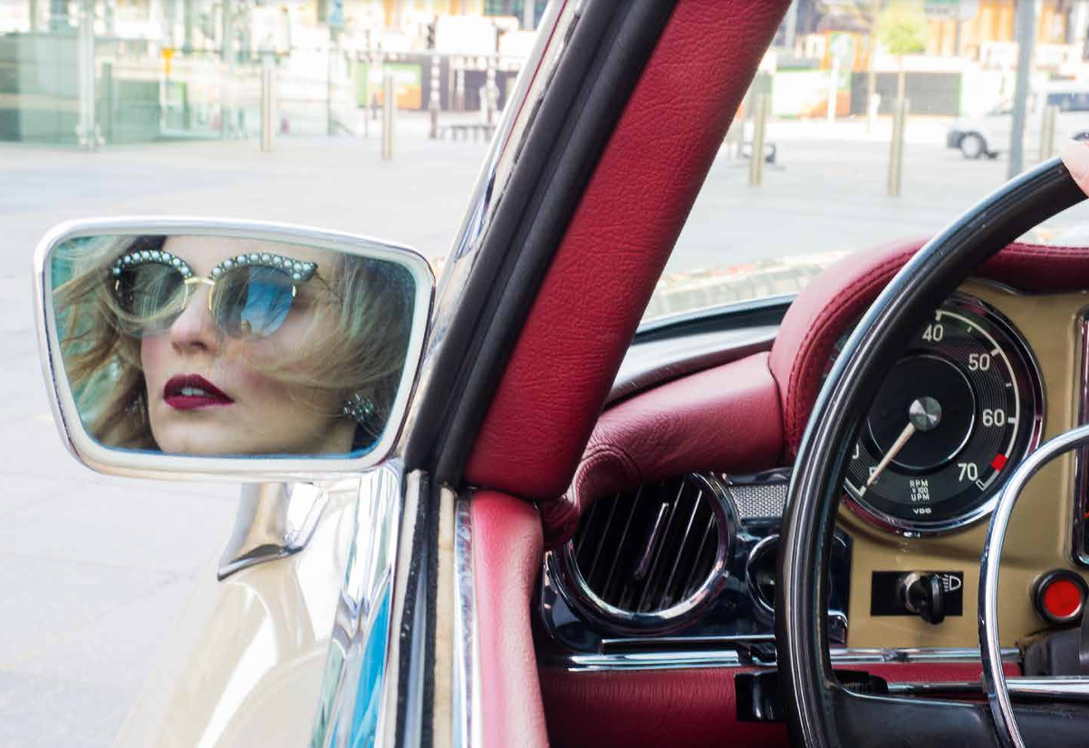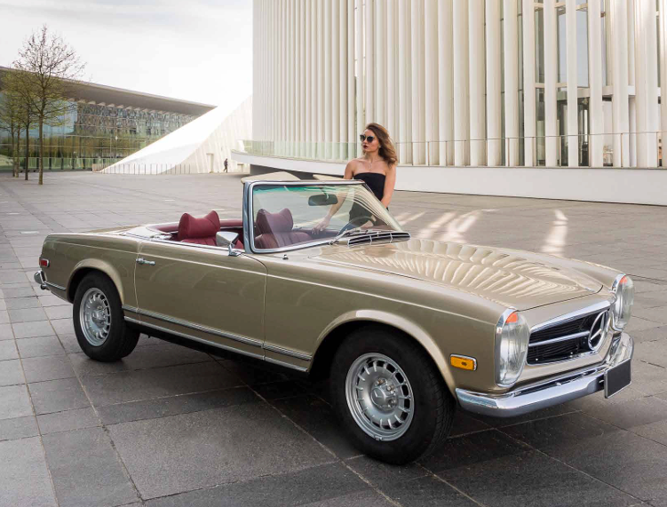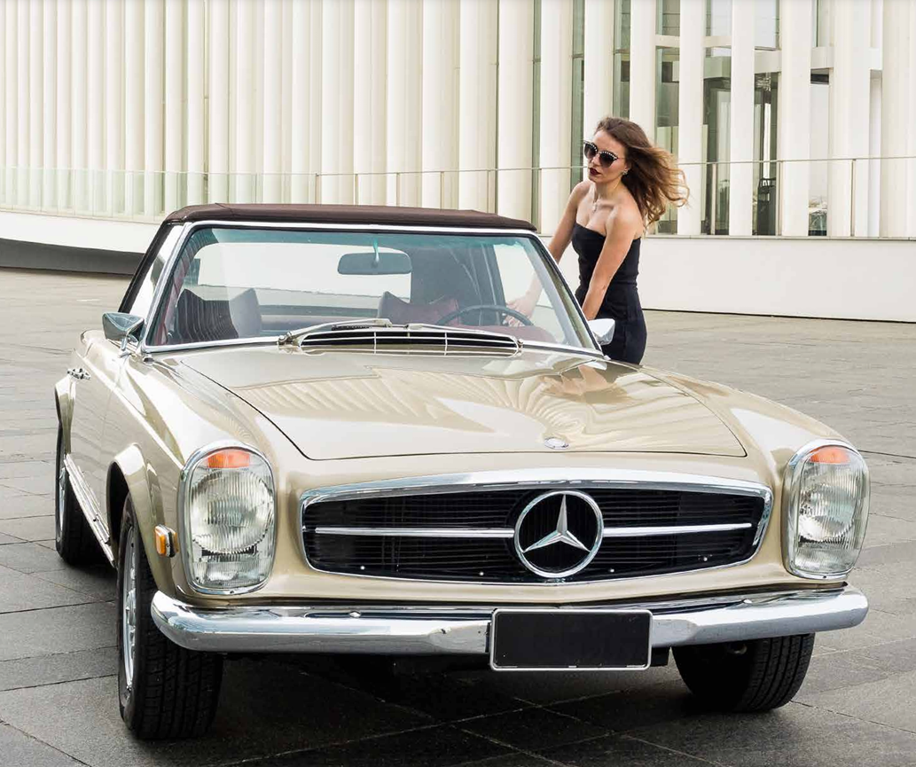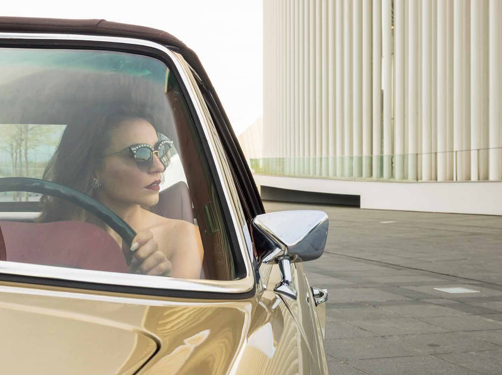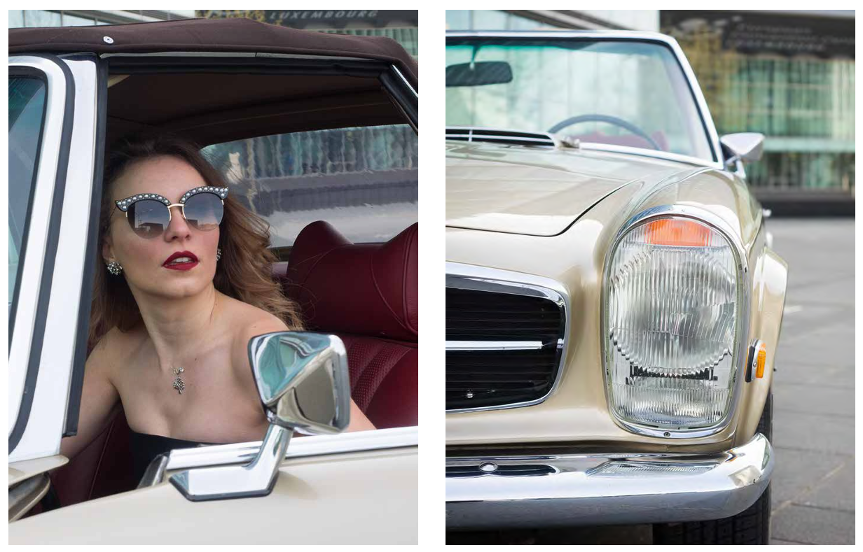 Pour Carl’s, Inês s’est prêtée au jeu de la « femme fatale » au volant d’une Mercedes-Benz 280 SL de 1970, série R113 Pagode. Comme toile de fond pour cette mise en scène glamour, la Philharmonie resplendit de toute sa blancheur éclatante. Le mystère est lancé. Comme dans « La mort aux trousses » d’Alfred Hitchcock, on peut se demander, tout comme Cary Grant dans le désert, d’où viendra le danger, d’où viendra l’ennemi
